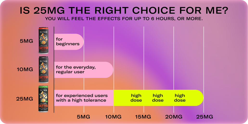 I've tried a few different brands and I've got to say that. Rythm got this right! the 25mg Sativa with a little caffeine added was the perfect hit to a chill evening! I only need half or 3/4 the can and I am set for a great night! My wife is a huge fan and she was a big Drink Delta person, but this is our drink of choice now!